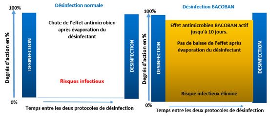 BACOBAN est un revêtement antiviral, antibactérien et antifongique à long terme qui peut être appliqué sur n'importe quelle surface par pulvérisation, lingette ou nébuliseur. Contrairement à la plupart des produits de protection de surface qui une fois appliqués ne durent que quelques minutes, BACOBAN reste actif jusqu'à 10 jours après l'application et résiste aux germes et virus les plus courants, y compris CORONAVIRUS (COVID-19) H69 / V70, SARM, VIH, hépatite B&C et Norovirus. Après des tests importants, BACOBAN a été approuvé comme une barrière efficace contre la fièvre hémorragique Ebola (Ebola ou EVD), déjà utilisée par les compagnies aériennes, les exploitants de bâtiments et la protection de la flotte d'ambulances en EUROPE.
