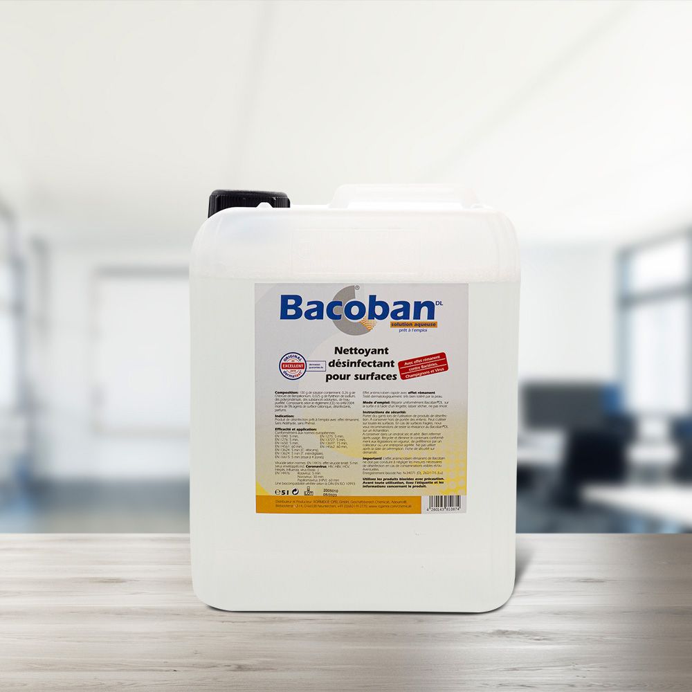 Bacoban un nouveau désinfectant innovant qui offre un effet résiduel grâce à la nanotechnologie. Bacoban est un désinfectant avec un temps de désinfection rapide, un effet antiviral de longue durée contre les bactéries, virus et champignons. Une fois évaporé, Bacoban forme une «nano-éponge» a effet résiduel. A travers cette couche de nano-éponge se trouvent des biocides qui, suite à une contamination, ce diffusent à la surface où ils tuent virus, bactéries et champignons. La solution désinfectante a Bacoban peut être utilisé comme nettoyant et désinfectant de choix pour fournir une protection anti-pathogène premium, avec un effet long terme pouvant aller jusqu'à 10 jours. Bacoban est compatible tout type de support, il peut facilement être intégré dans les programmes de nettoyage et de désinfection. La couche de nanocoat de Bacoban offre une surface facile à nettoyer qui peut réduire le temps de nettoyage jusqu'à 50%. En réduisant les salissures dues à l'énergie de surface, la poussière et les autres particules adhèrent librement à la surface, ce qui leur permet d'être facilement éliminées. Bacoban, conçu pour les normes d'hygiène les plus strictes, vous aidera à améliorer le contrôle général des infections.